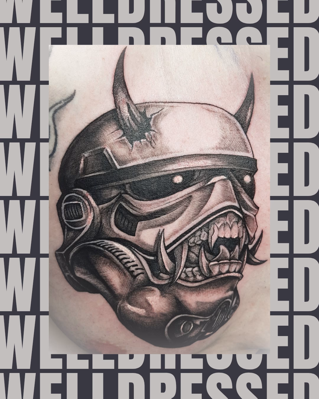 Ein allseits bekannter Stormtrooper Helm aus StarWars. Angepasst und modifiziert mit klassischen Hannya Elementen. Einer Maske aus der japanischen Kultur die für Wut und Eifersucht steht.