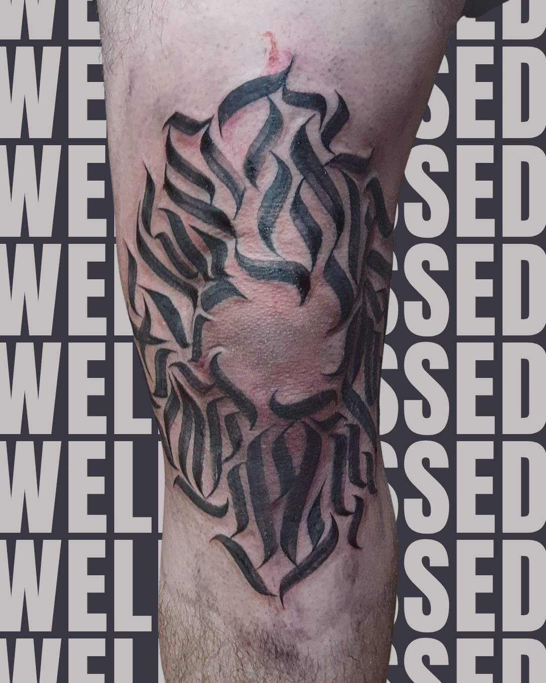 Kalligrafie inspirierte Ornamente. Brachial und trotzdem weich im Design. Durch freihändiges Aufzeichnen passt es sich dem Knie optimal an.